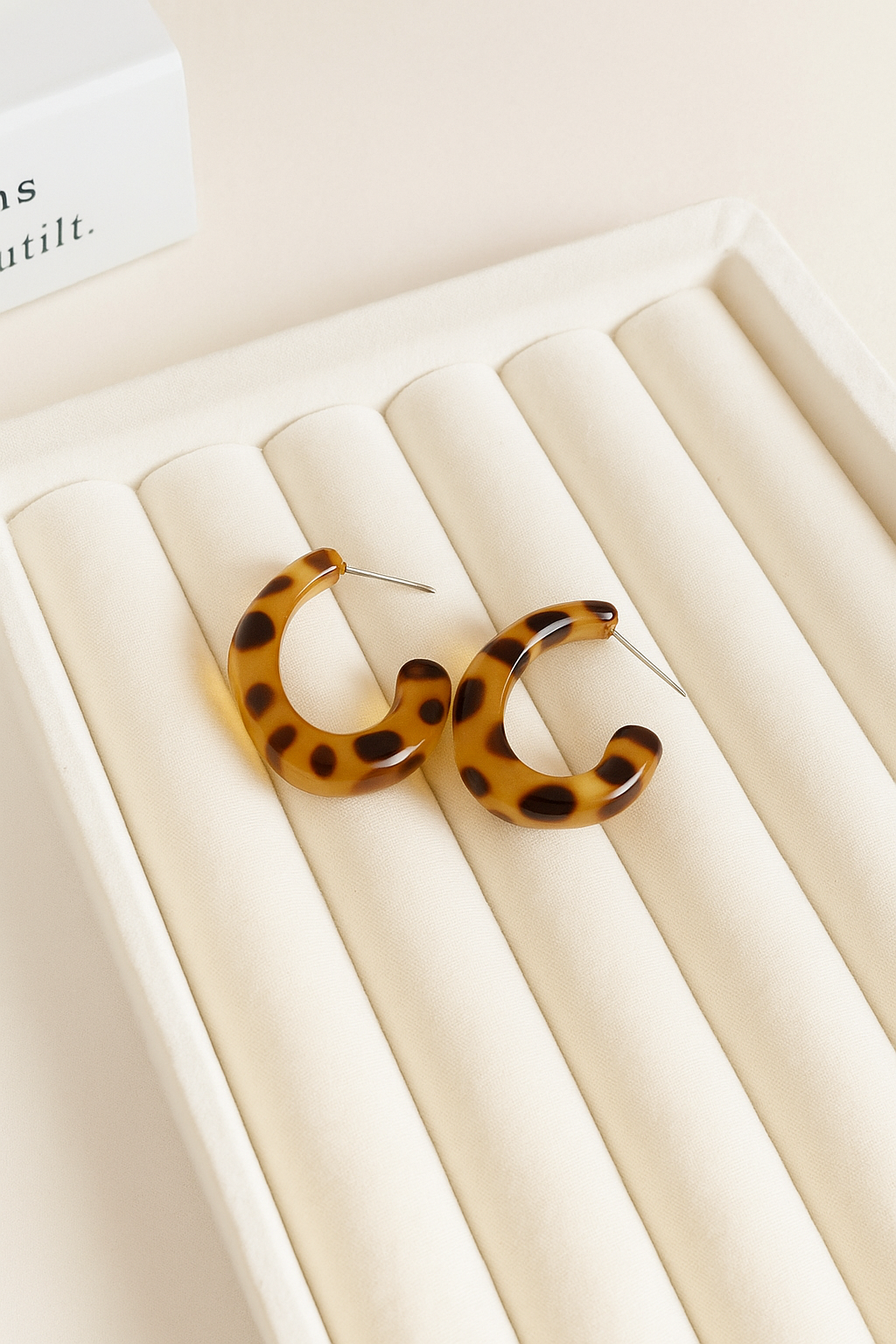 Fabriquées en résine marbrée effet écaille, elles jouent avec les nuances de miel, brun café et ambre doré, captant la lumière à chaque mouvement.