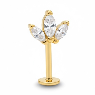 Ses trois pétales en zircons étincelants s’ouvrent comme une fleur dorée au soleil, symbole de féminité, de douceur et d’élégance.