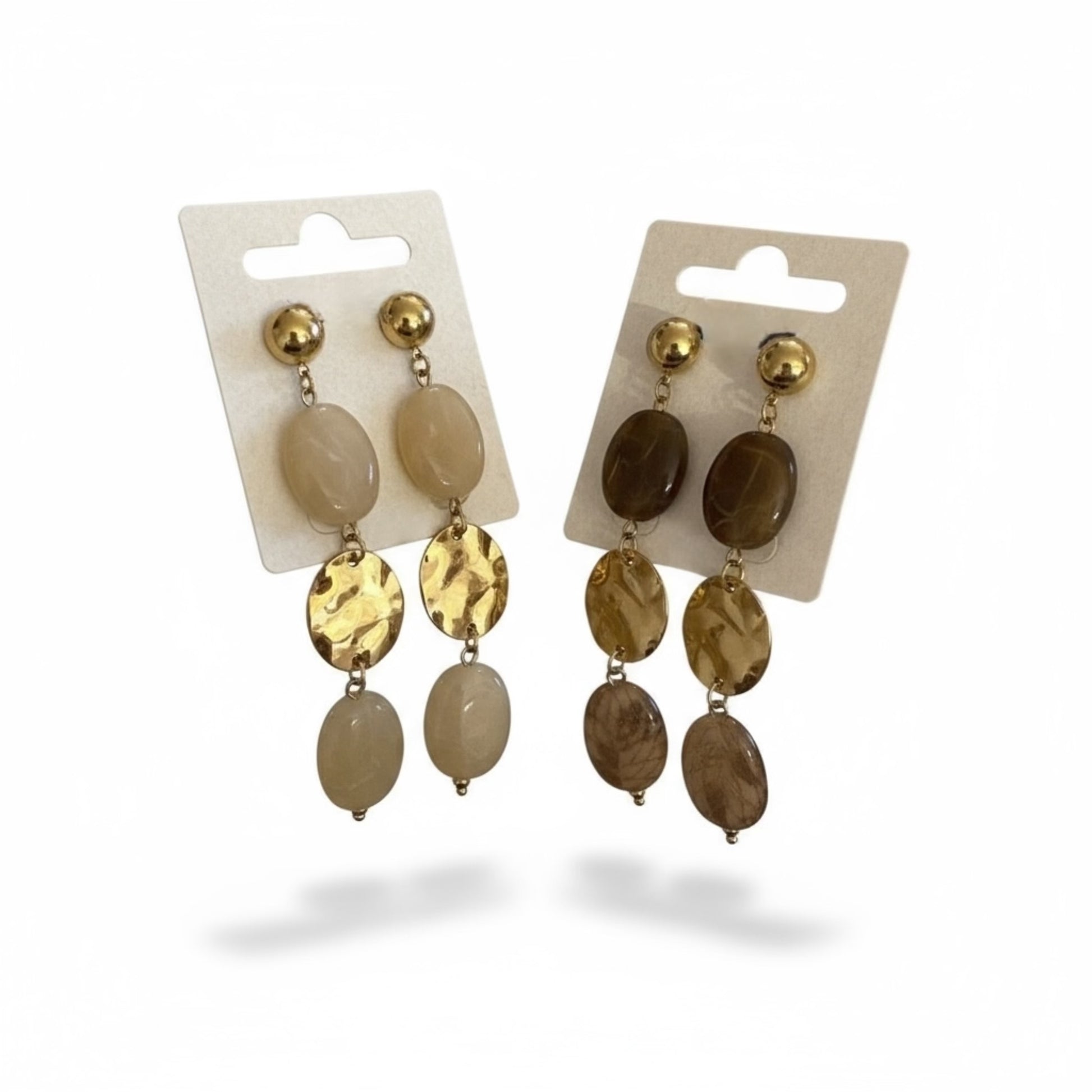Composées de trois éléments harmonieux, elles associent une sphère dorée en acier inoxydable 316L, une pièce martelée brillante, et une pierre ovale effet minéral, disponible en deux nuances — beige nacré ou brun terre de sienne.