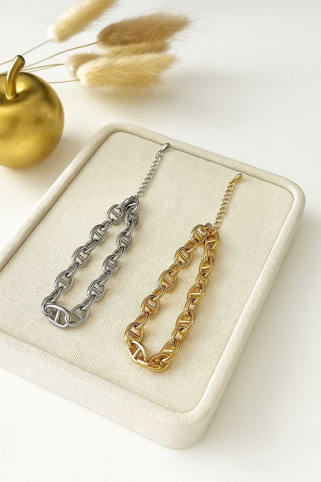 Le bracelet Aelys séduit par son design audacieux et intemporel. Conçu en acier au titane plaqué ou en finition argentée , il se distingue par ses maillons ovales entrelacés au style architectural.