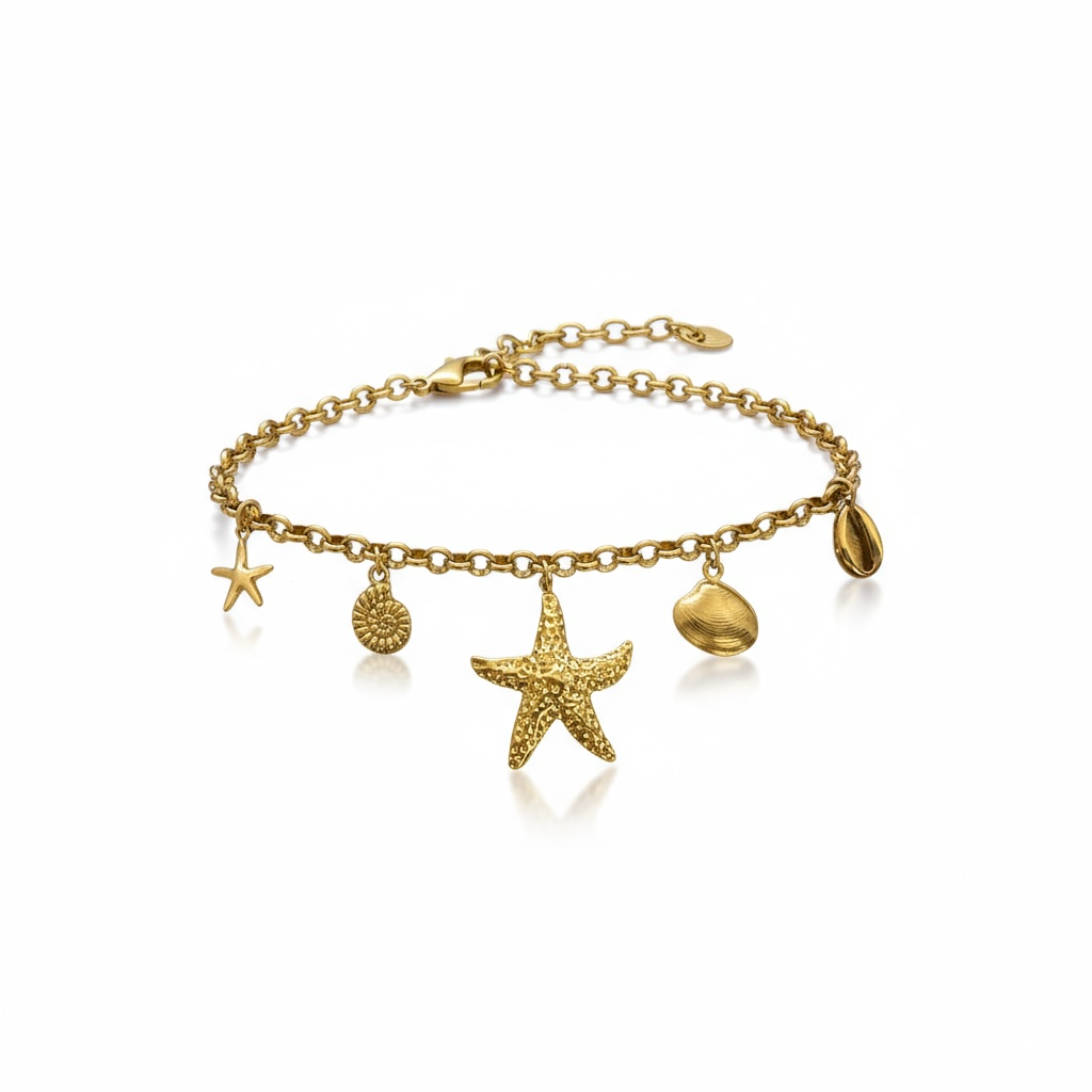 Orné de charms marins — étoile de mer, coquillages et coraux dorés — il capture l’essence des plages dorées et des vagues scintillantes.