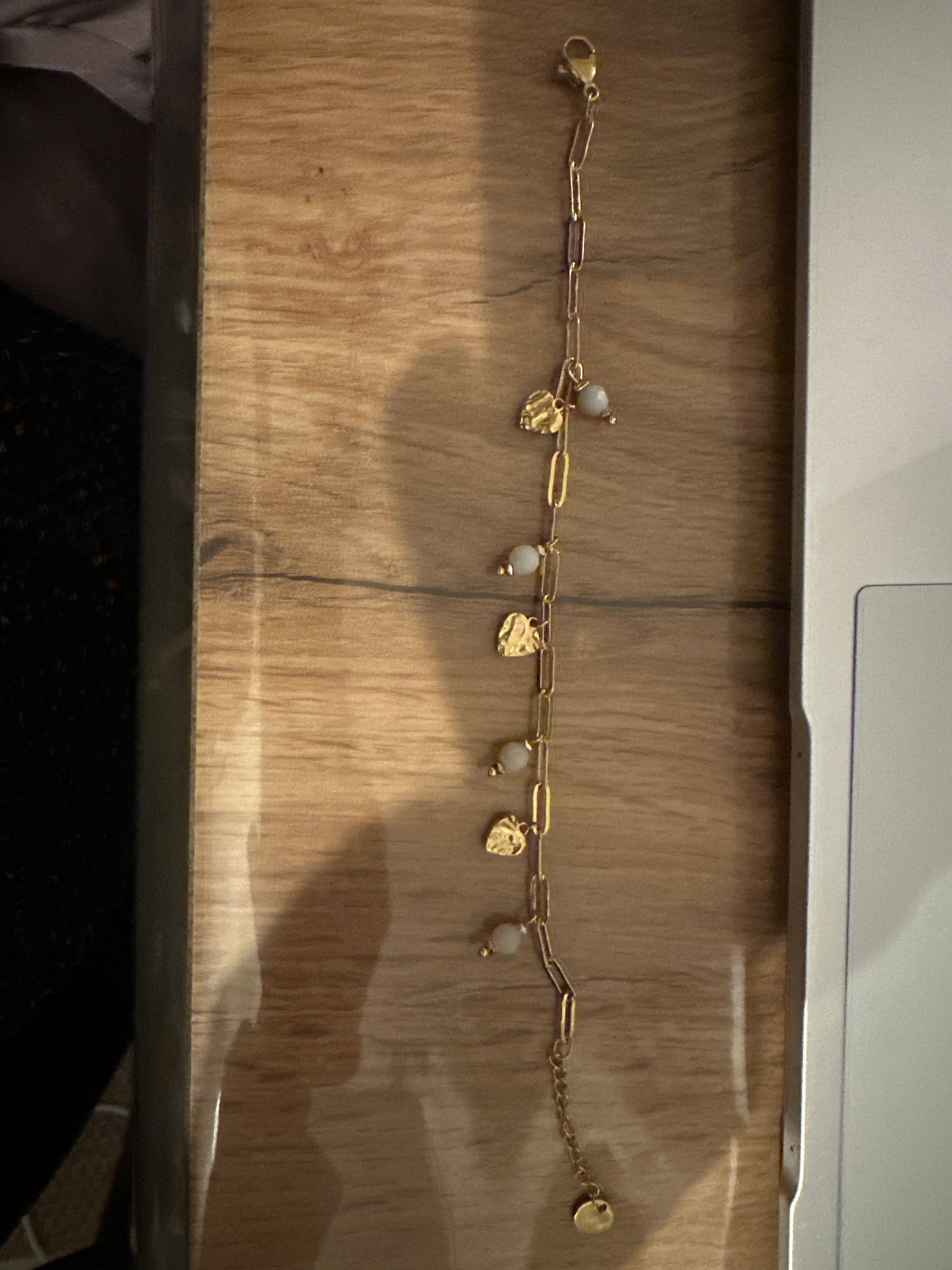 Un bracelet doré et nacré, aussi poétique qu’intemporel — pour celles qui aiment porter la tendresse au poignet.