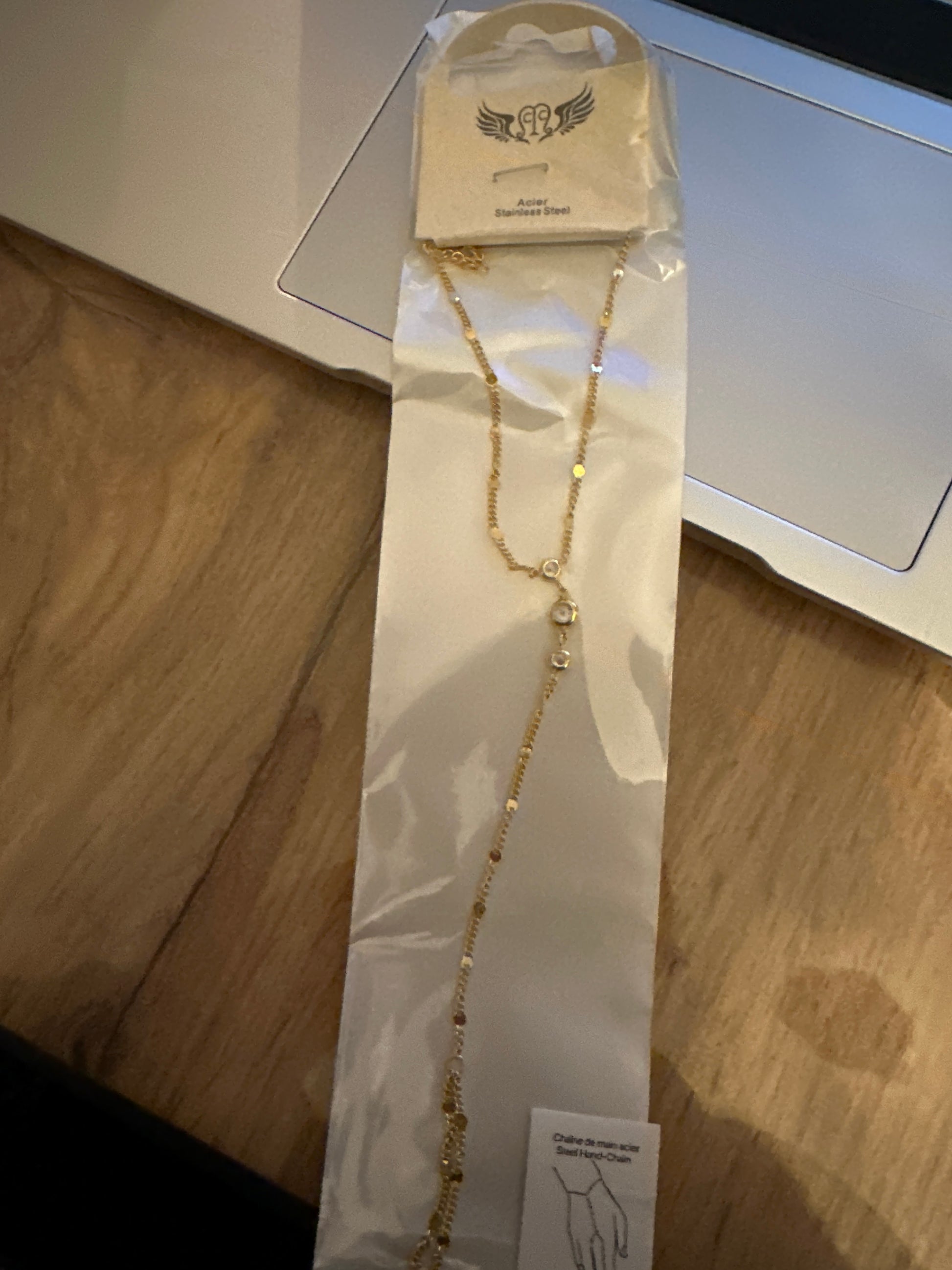 Sa délicate chaînette dorée enlace la main avec élégance, reliant le poignet et le doigt par un jeu de reflets subtils.