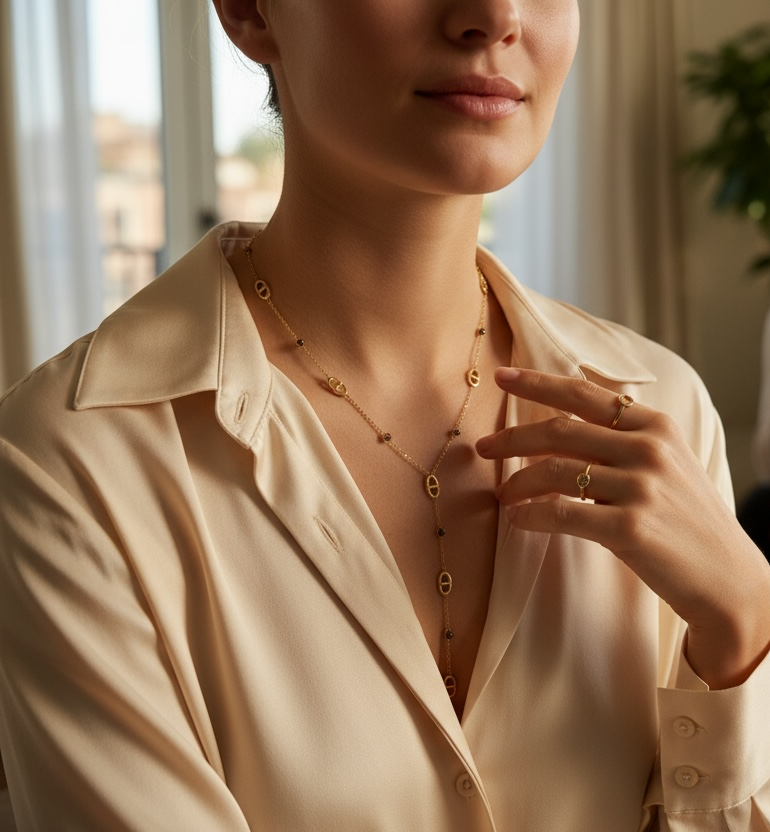 Avec sa forme en Y, il allonge subtilement le décolleté et apporte une allure féminine et distinguée.