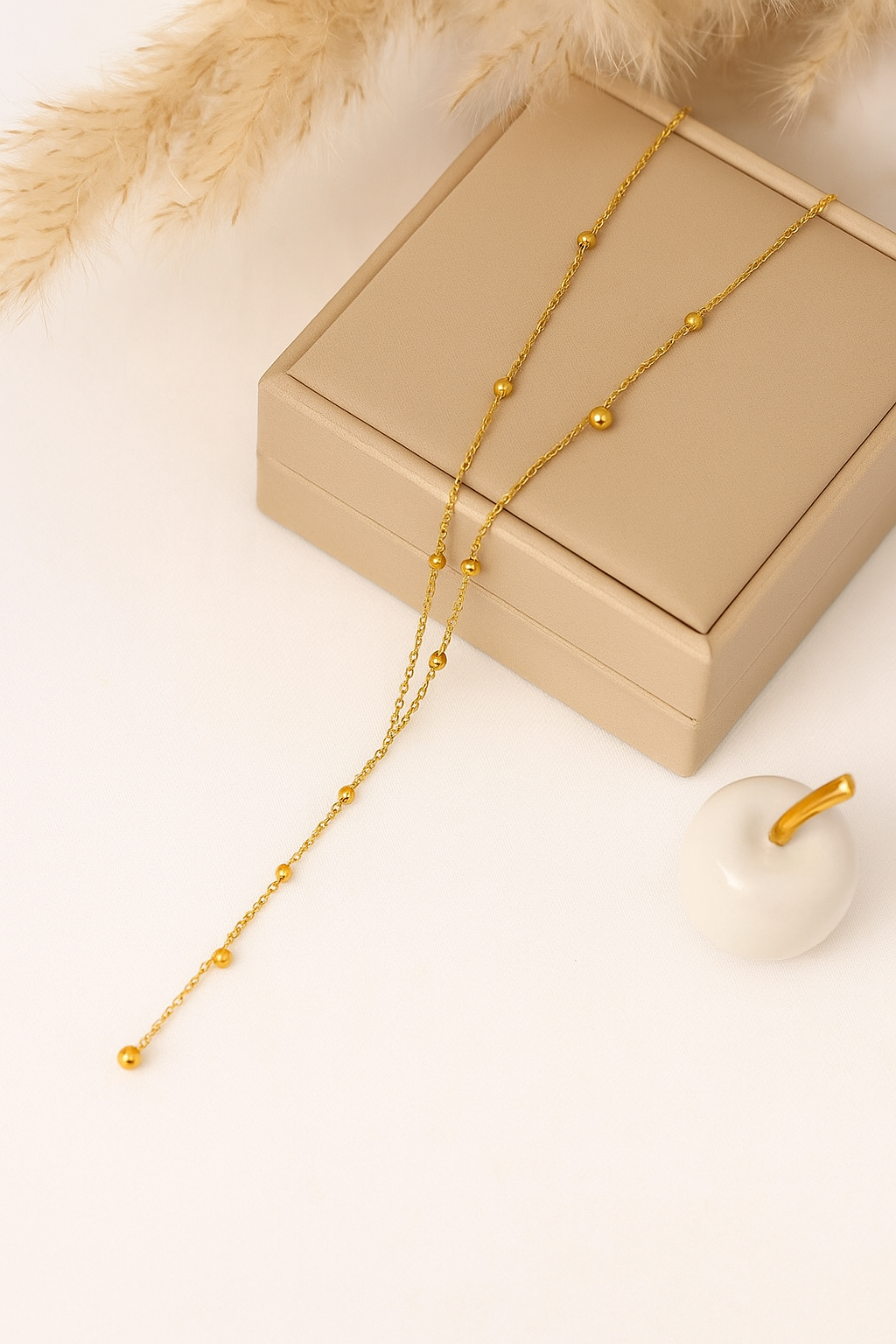 Composé d’une fine chaîne dorée ornée de délicates perles métalliques, il évoque la grâce du mouvement et la douceur d’un éclat doré qui danse sur la peau.