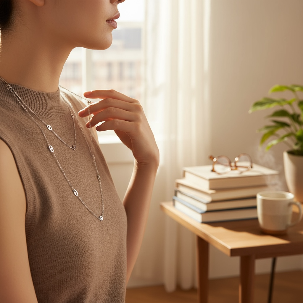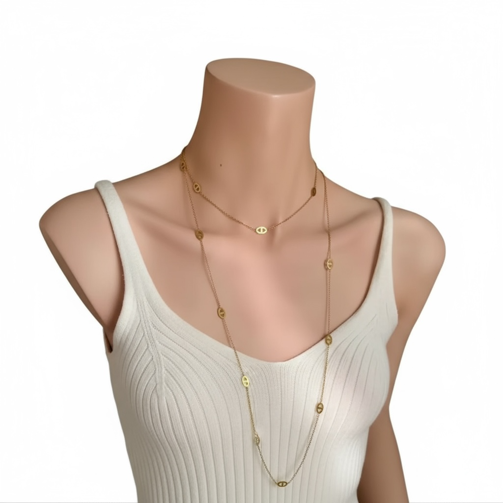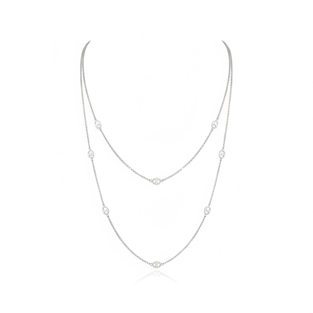 Long et raffiné, ce sautoir en acier inoxydable est orné de maillons ovales ajourés qui captent la lumière à chaque mouvement.