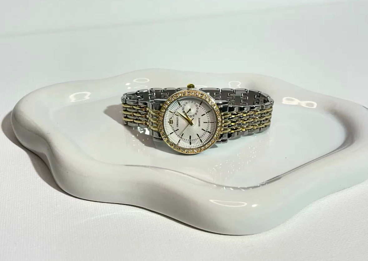 • Strass scintillants : Des strass délicatement incrustés autour du cadran ajoutent une touche d’éclat et de luxe à la montre.
