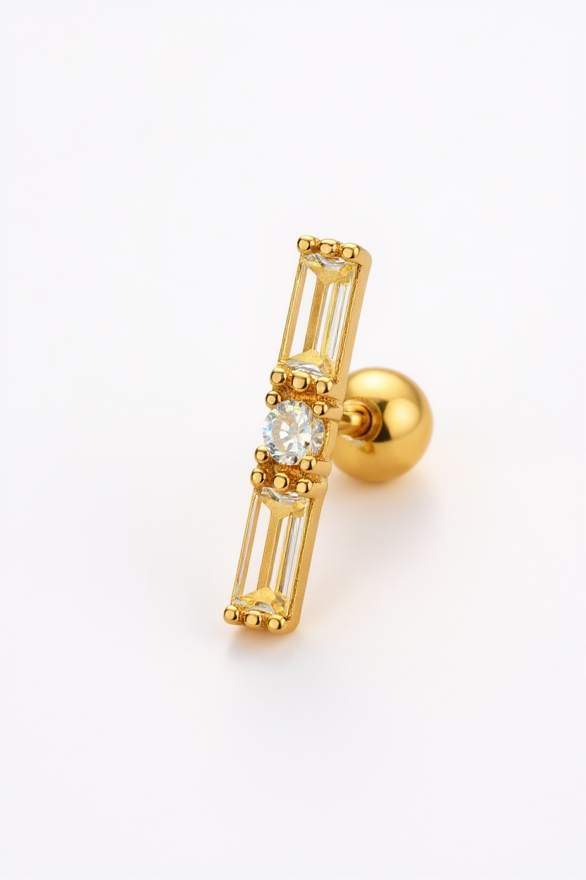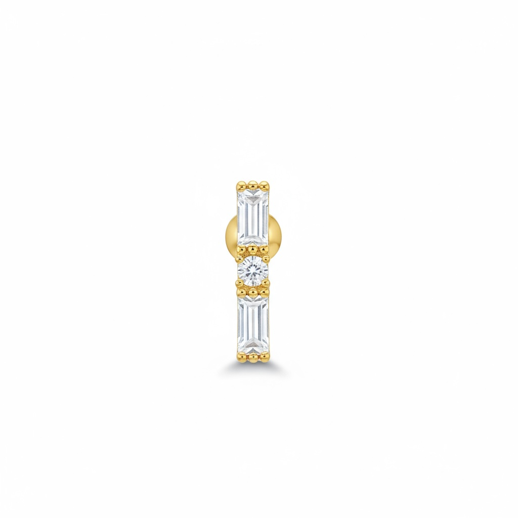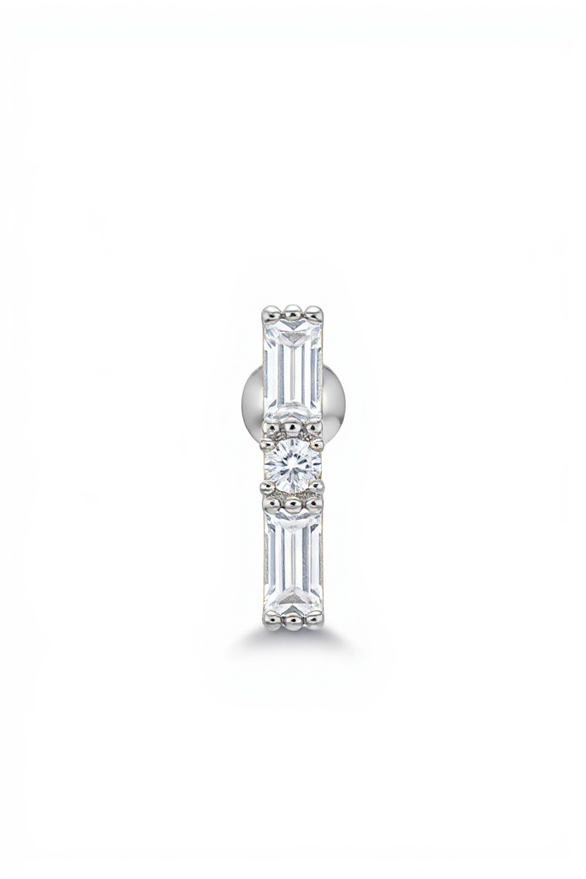 Composé de trois zircons taillés avec précision – deux baguettes encadrant une pierre ronde centrale – il reflète un équilibre parfait entre rigueur et raffinement.