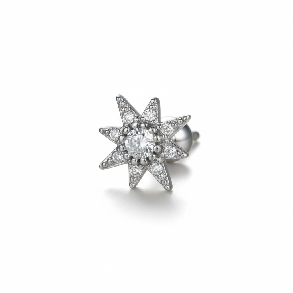 Le piercing Naïra séduit par sa beauté solaire et sa finesse intemporelle. Inspiré par les rayons du soleil, il se compose d’une étoile à huit branches sertie de zircons étincelants, dont un cristal central d’une brillance exceptionnelle.