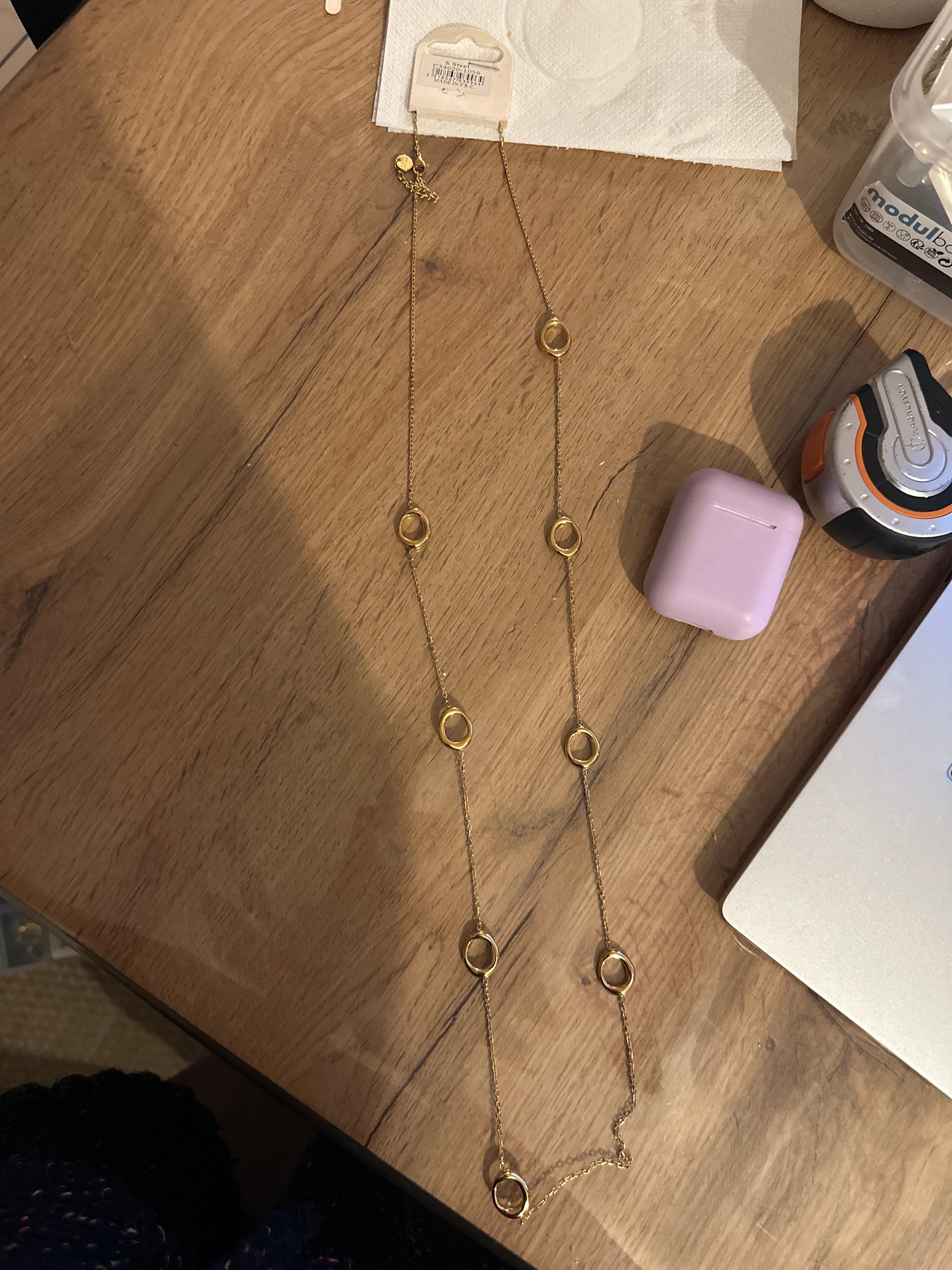 Sa fine chaîne dorée est rythmée par de délicats anneaux texturés, formant un bijou raffiné qui capte la lumière avec une douceur subtile.